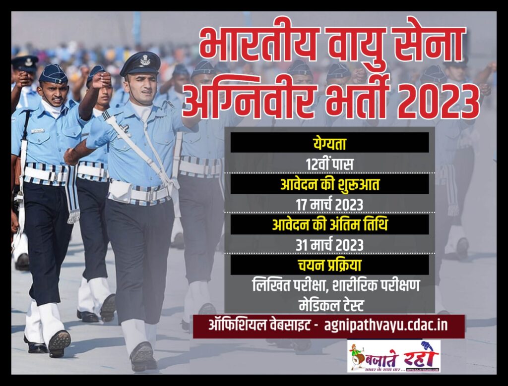 नोटिफिकेशन के मुताबिक सरकारी नौकरी की तैयारी कर रहे इच्छुक और योग्य अविवाहित पुरुष और महिला अग्निवीर वायु की आधिकारिक वेबसाइट anipathvayu.cdac.in पर जाकर ऑनलाइन आवेदन कर सकते हैं। भर्ती परीक्षा 20 मई को होगी, जिसके लिए ऑनलाइन आवेदन 17 मार्च से 31 मार्च तक किये जा सकते हैं। साइंस स्ट्रीम वालों के लिए मान्यता प्राप्त बोर्ड से गणित, फिजिक्स और अंग्रेजी विषय के साथ कम से कम 50 प्रतिशत अंकों के साथ पास होना चाहिए। इसके अलावा अंग्रेजी विषय में 50 प्रतिशत अंक होने जरूरी हैं। आयु सीमा के लिए अधिसूचना में कहा गया है कि योग्य उम्मीदवारों का जन्म 26 दिसंबर, 2006 से 26 जून, 2006 के बीच हुआ होना चाहिए। यानी आयु सीमा 21 वर्ष से अधिक न हो।