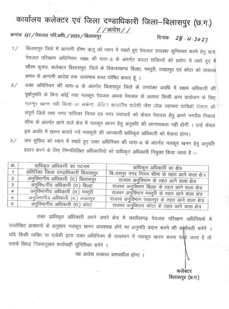 बिलासपुर – जिले में ग्रीष्म ऋतु को ध्यान में रखते हुए पेयजल उपलब्धता सुनिश्चित करने हेतु कलेक्टर श्री सौरभ कुमार ने जिले के बिल्हा, मस्तूरी, तखतपुर, कोटा को आगामी आदेश तक जलाभाव ग्रस्त घोषित किया है। कलेक्टर ने ग्रीष्म ऋतु को ध्यान में रखते हुए नलकूप खनन पर रोक लगा दी है। कलेक्टर ने इस आशय का आदेश जारी किया है।