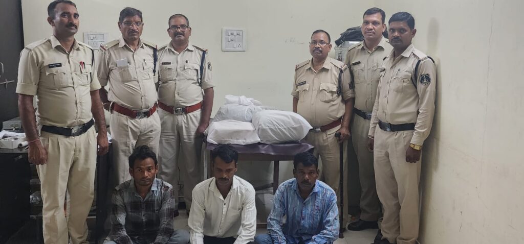 कार्यवाही को संपादित कर रही थाना तारबाहर,ACCU और RPF की टीम को पुराना बस स्टैंड (तारबाहर) के पास तीन संदिग्ध व्यक्ति मिले। दया शंकर पिता राम किशोर 34 वर्ष, परसौंजा, पहाड़ी, चित्रकूट उत्तर प्रदेश ,प्रह्लाद लोधी पिता जगदीश प्रसाद उम्र 43 बेलपुरा, रांची, रामकुमार मग्घू पिता मालीराम उम्र 47 वर्ष पता रांझी जबलपुर तीनों व्यक्ति से विधिवत सूक्ष्मता से पूछताछ करने पर अवैध मादक पदार्थ गांजा रखना बताए, जिसे गवाहों के समक्ष विधिवत जप्त किया गया है।