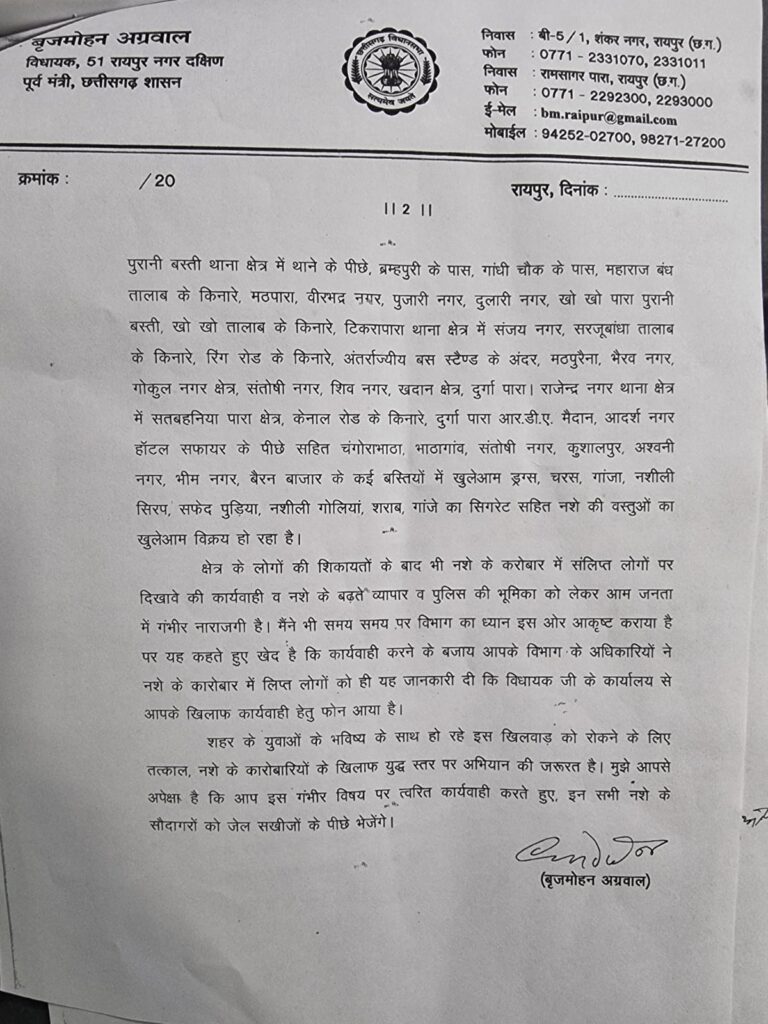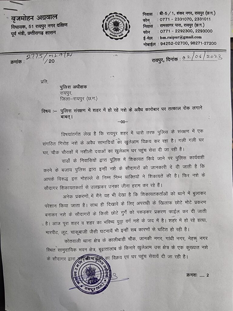 बृजमोहन ने रायपुर एसपी को लिखा पत्र। और कहा कि नशे के सौदागरों के साथ पुलिस की मिलीभगत समाज व छत्तीसगढ़ के लिए खतरनाक।