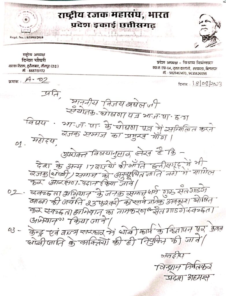भारतीय जनता पार्टी छत्तीसगढ़ की घोषणा पत्र निर्माण समिति के प्रदेश संयोजक सांसद दुर्ग माननीय विजय बघेल , पूर्व मंत्री प्रदेश सह संयोजक घोषण पत्र समिति माननीय अमर अग्रवाल बिलासपुर प्रवास पर राष्ट्रीय रजक महासंघ प्रदेश अध्यक्ष श्री विश्राम निर्मलकर द्वारा धोबी रजक जाति संख्या लगभग प्रदेश में लगभग 12 लाख है समाज आर्थिक, शैक्षणिक, राजनीतिक से पिछड़ा हुआ समाज है जीवन स्तर ऊंचा उठाने विधानसभा चुनाव में घोषणा पत्र में शामिल करने के लिए निम्न मांगे रखी