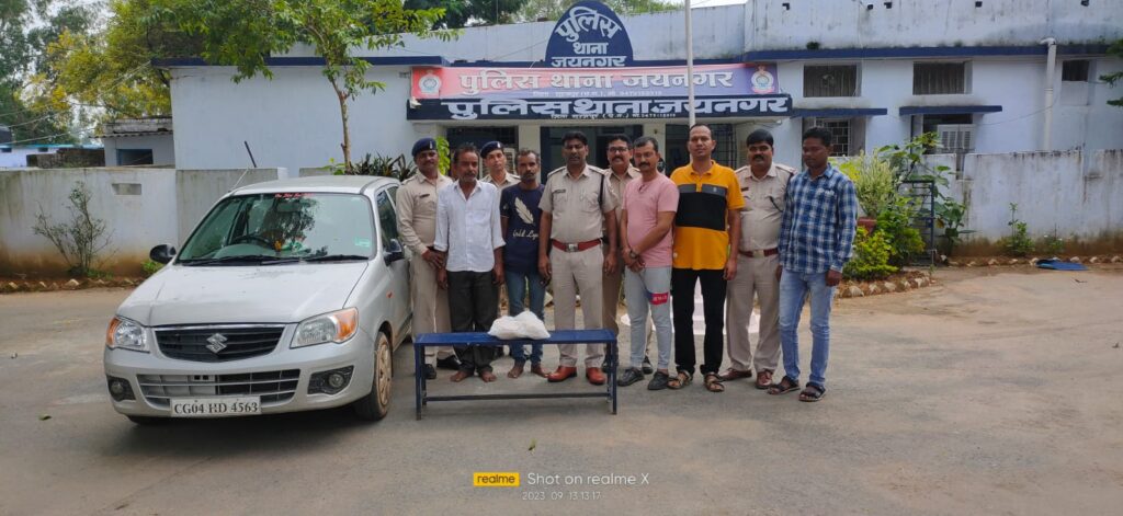पुलिस को मुखबीर से सूचना मिला कि एक आल्टो कार में 2 व्यक्ति गांजा लेकर ग्राम राजापुर तरफ से ग्राम कन्दरई चौक होते हुए बिक्री करने जाने वाले है। सूचना पर थाना जयनगर की पुलिस ने त्वरित कार्यवाही करते हुए कन्दरई चौक के पास घेराबंदी कर आल्टो कार सहित विजय चौरसिया पिता स्व. सत्य नारायण उम्र 40 वर्ष व अशोक चौरसिया पिता स्व. सत्य नारायण उम्र 52 वर्ष निवासी ग्राम कुंजनगर, थाना जयनगर को पकड़ा जिनके कब्जे से 2 किलो गांजा जप्त किया गया जिसकी कीमत करीब 50 हजार रूपये है। मामले में गांजा व परिवहन में प्रयुक्त आल्टो कार क्रमांक सीजी 04 एचडी 4563 को जप्त कर धारा 20(बी) एनडीपीएस एक्ट के तहत कार्यवाही कर दोनों आरोपियों को गिरफ्तार किया गया। कार्यवाही अतिरिक्त पुलिस अधीक्षक शोभराज अग्रवाल व सीएसपी एस.एस.पैंकरा के मार्गदर्शन में थाना प्रभारी जयनगर सरफराज फिरदौसी व उनकी टीम सक्रिय रही।