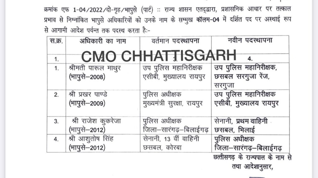प्रखर पांडेय पुलिस अधीक्षक मुख्यमंत्री सुरक्षा रायपुर से रायपुर एसीबी में डीआईजी बनाए गए हैं। राजेश कुकरेजा पुलिस अधीक्षक जिला सारंगढ़-बिलाईगढ़ से सेनानी प्रथम वाहिनी छसबल भिलाई बनाए गए हैं। आशुतोष सिंह सेनानी 13वीं वाहिनी छसबल कोरबा से पुलिस अधीक्षक सारंगढ़-बिलाईगढ़ बनाए गए हैं।